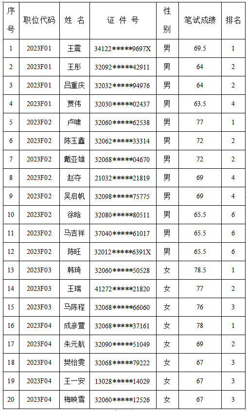 根据《江苏工程职业技术学院2023年公开招聘专职辅导员公告》要求,学校于2023年12月10日组织了公开招聘笔试考核。现将进入面试考核的应聘人员的成绩公示如下: